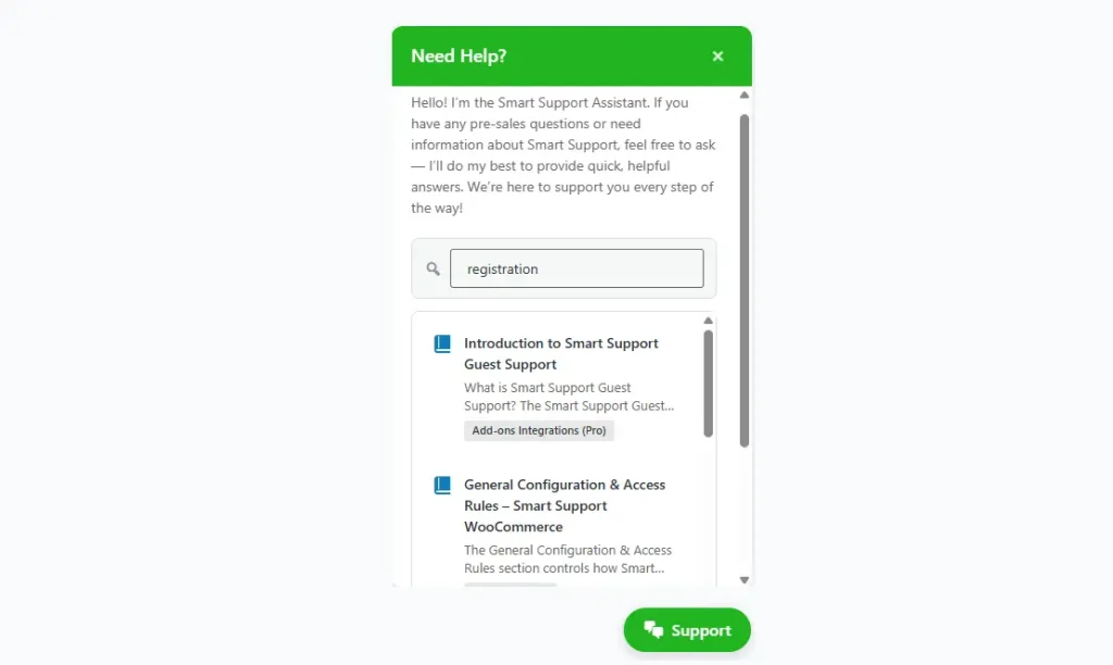 Smart Widget allows users to search documentation, view tickets, and contact support directly from a floating interface. This improves accessibility and creates a smoother support experience, especially for product pages, checkout pages, and logged-in user dashboards.