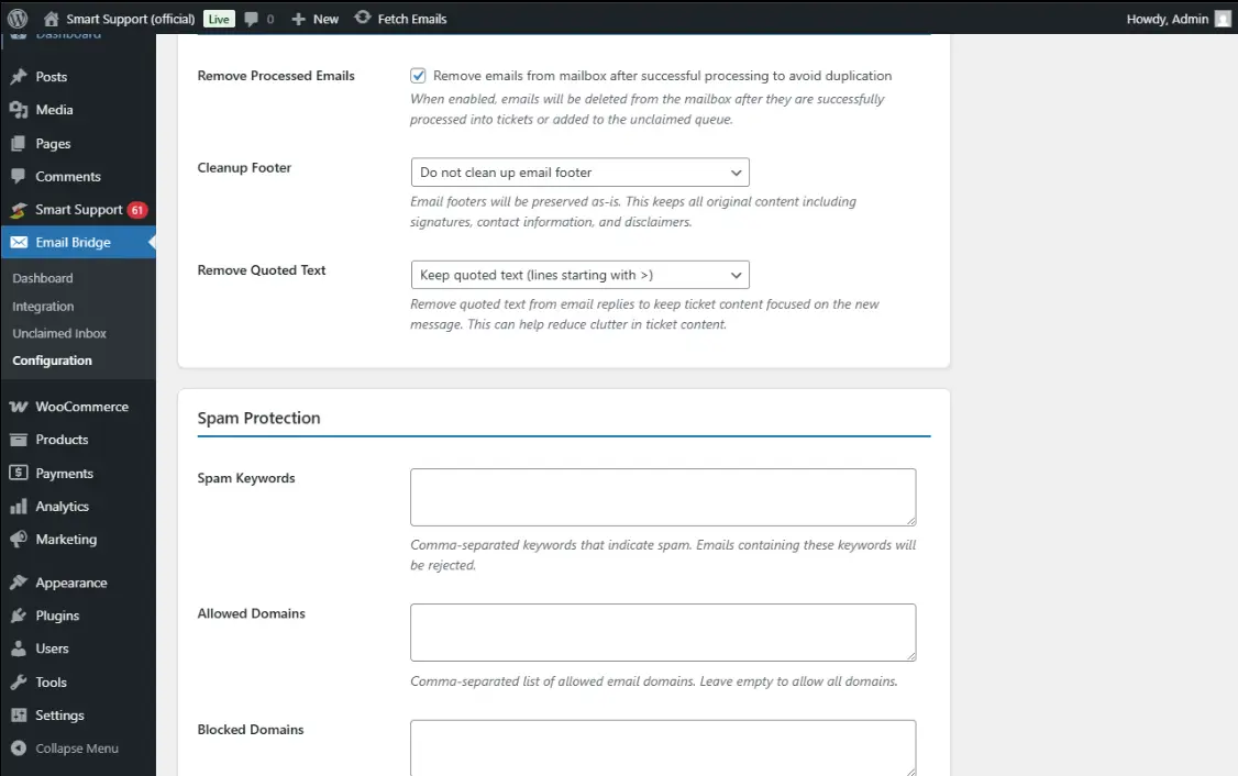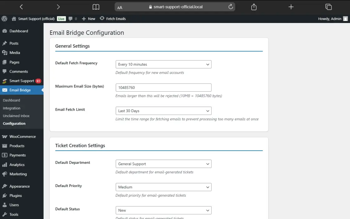 WP Dashboard > Smart Support > Email Bridge > Configuration