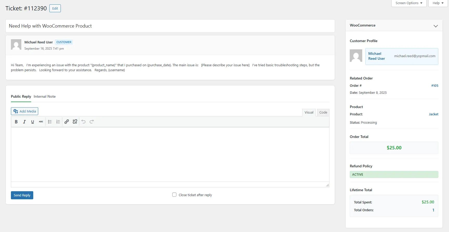 In the ticket view, a WooCommerce Widget displays:- Customer Profile: Name, email, account status.